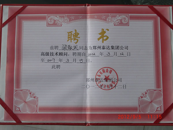 特聘河南省黃金局教授級(jí)高級(jí)工程師梁敬武先生為我鄭州泰達(dá)集團(tuán)公司高級(jí)技術(shù)顧問(wèn)。