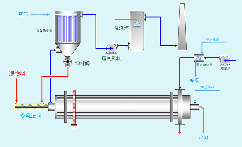 黑米烘干機(jī)利用熱傳導(dǎo)和熱輻射原理,蒸汽在管束內(nèi)與物料呈逆流或順流方式,物料在負(fù)壓封閉腔內(nèi)通過管束上的鏟板攪拌和推動,由進(jìn)料端向出料端移動,一部分成品物料通過卸料槽到卸料螺旋,經(jīng)排料關(guān)風(fēng)機(jī)排出。另一部分成品物料通過返料關(guān)風(fēng)機(jī)到混料螺旋,經(jīng)輸送攪拌機(jī)與濕物料充分?jǐn)嚢杌旌希档驮紳裎锪系暮浚_(dá)到干燥機(jī)的理想工作條件。