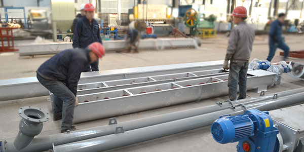 螺旋輸送機的工作原理是旋轉的螺旋葉片將物料推移而進行螺旋輸送機輸送,使物料不與螺旋輸送機葉片一起旋轉的力是物料自身重量和螺旋輸送機機殼對物料的摩擦阻力。螺旋輸送機旋轉軸上焊的螺旋葉片,葉片的面型根據(jù)輸送物料的不同有實體面型、帶式面型、葉片面型等型式。螺旋輸送機的螺旋軸在物料運動方向的終端有止推軸承以隨物料給螺旋的軸向反力,在機長較長時,應加中間吊掛軸承。
