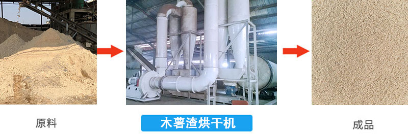 木薯渣烘干機主要由供熱源、進料機、回轉滾筒、出料機、引風機、卸料器和配電柜構成;脫水后的濕木薯渣進入木薯渣干燥機后,在滾筒內均布的抄板翻動下,在烘干機內均勻分散與熱空氣充分接觸,加快了烘干傳熱﹑傳質。在烘干過程中,木薯渣在帶有傾斜度的抄板和熱介質的作用下,至烘干機另一段排出烘干成品。生產線的工藝參數(shù)和各設備技術參數(shù)及結構的選取和設計是在經(jīng)過對木薯渣物料的認真分析研究才得出,并經(jīng)過實際木薯渣烘干試驗的驗證。在方案設計當中、充分考慮到木薯渣水分含量大、蛋白含量高、粘性大的特點,并采取了一系列新技術和工藝來加以解決,以確保良好的烘干效果。