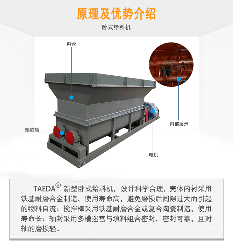 臥式給料機(jī)是一種新型高效給料設(shè)備,按照原料特性,分為滑架式破拱給料機(jī)(適用于高粘度物料的攪拌打散給料),圓盤給料機(jī)(適用于顆粒類流動(dòng)性好的原料),多軸均勻給料機(jī)(適用于生物質(zhì)原料),雙軸打散給料機(jī)(適用于煤泥類原料),膠帶箱式給料機(jī)(適合于通用性原料)。泰達(dá)會(huì)根據(jù)不同物料配置適合的臥式給料機(jī),實(shí)現(xiàn)連續(xù)的或不間斷的供料輸送,并且具有較大的暫存緩沖作用,儲(chǔ)料量一般在10m3以上。全系列臥式給料機(jī)都采用耐磨特性材料,具有結(jié)構(gòu)合理,堅(jiān)固耐用,運(yùn)轉(zhuǎn)平穩(wěn)等特點(diǎn),廣泛用于工礦企業(yè),是比較理想的連續(xù)給料輸送設(shè)備。